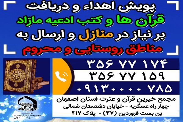 یادآور میشود، علاقهمندان به منظور مشارکت در این طرح میتوانند با شمارههای 035677174، 035677159 و 09130000785 تماس بگیرند یا به مجمع خیران قرآن و عترت استان اصفهان به نشانی چهارراه عسگریه، خیابان دشتستان شمالی، بنبست فروردین 37، پلاک 217 مراجعه کنند.