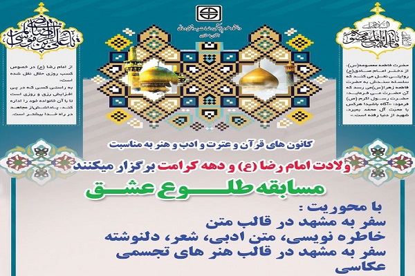 به گزارش ایکنا، مسابقه «طلوع عشق» از سوی کانونهای قرآن و عترت و ادب و هنر دانشگاه علوم پزشکی سمنان بهمناسبت ولادت امام رضا(ع) و دهه کرامت برای عموم دانشجویان برگزار میشود.