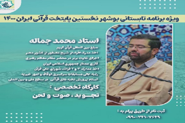 به گزارش ایکنا، مجموعه کارگاههای تخصصی آموزشی قرآن کریم از سوی مؤسسه فرهنگی ـ مردمی قرآن و عترت بینات بوشهر برگزار میشود. این دورهها شامل آموزش روخوانی، روانخوانی، تجوید، صوت و لحن، حفظ، مفاهیم، تفسیر، قصه و ترجمه به انگلیسی است.