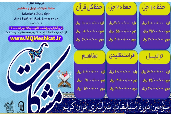 به گزارش ایکنا، سومین دوره مسابقات سراسری قرآن کریم «مشکات» ویژه بانوان و آقایان در دو گروه سنی زیر 16 سال و بالای 16 سال برگزار میشود.