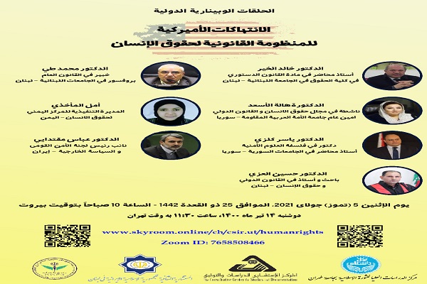 وبینار «نقض منظومه قانونی حقوق بشر از سوی آمریکا» با همکاری مرکز مطالعات عالی انقلاب اسلامی وابسته به دانشگاه تهران و مرکز مطالعات، مشاوره و اسناد لبنان و رایزنی فرهنگی جمهوری اسلامی ایران در لبنان و با حضور اساتید و کارشناسانی از ایران، لبنان، سوریه و یمن برگزار می‌شود.
