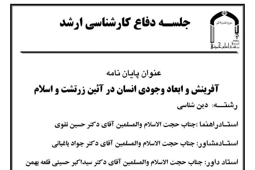 به گزارش ایکنا، پایاننامه «آفرینش و ابعاد وجودی انسان در آئین زرتشت و اسلام» از سوی حجتالاسلام رمضانعلی مرزانی تدوین شده و حجتالاسلام والمسلمین حسین نقوی راهنمایی آن را بر عهده داشته است. مشاوره این رساله نیز بر عهده حجتالاسلام والمسلمین جواد باغبانی بوده است.