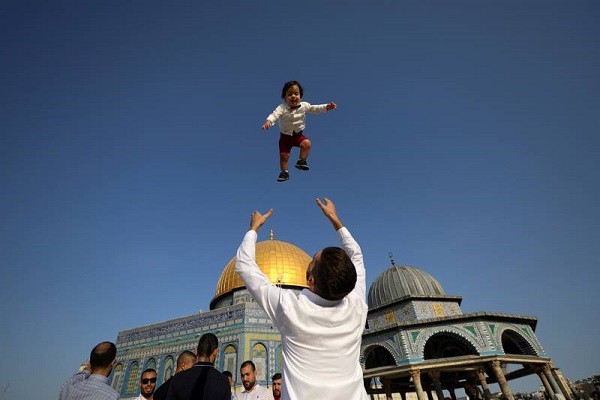 بازی یک پدر و کودک در محوطه مسجدالاقصی، بیتالمقدس، فلسطین