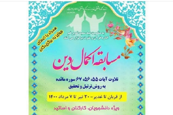 به گزارش ایکنا، مسابقه اکمال دین با محوریت تلاوت آیات 55، 56 و 67 سوره مائده به روش قرائت ترتیل و قرائت تحقیق از سوی اداره قرآن و عترت دانشگاه علوم پزشکی جندیشاپور اهواز برگزار میشود.