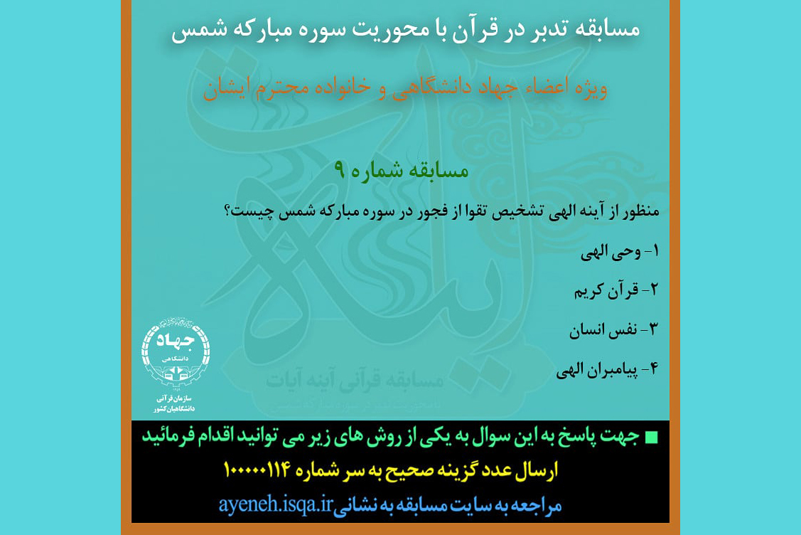این مسابقه با محوریت سوره مبارکه شمس و با هدف توسعه فرهنگ قرآنی در میان اعضای جهاددانشگاهی و خانواده آنها به دو روش اینترنتی و پیامکی برگزار میشود.