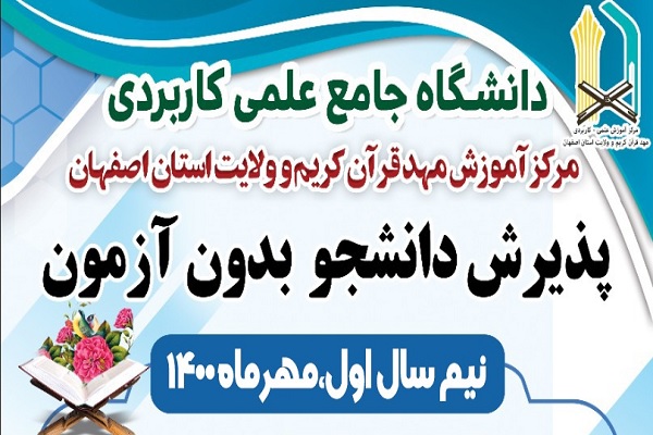 به گزارش ایکنا، دانشگاه جامع علمی ـ کاربردی مرکز آموزش مهد قرآن کریم و ولایت استان اصفهان اقدام به پذیرش دانشجوی بدون آزمون برای نیم سال تحصیلی اول مهر 1400 میکند.