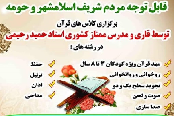 به گزارش ایکنا، کلاسهای آموزش قرآن با حضور حمید رحیمی، قاری ممتاز کشورمان در شهرستان اسلامشهر و ویژه بانوان و آقایان در دو سطح مبتدی و حرفهای برگزار میشود.