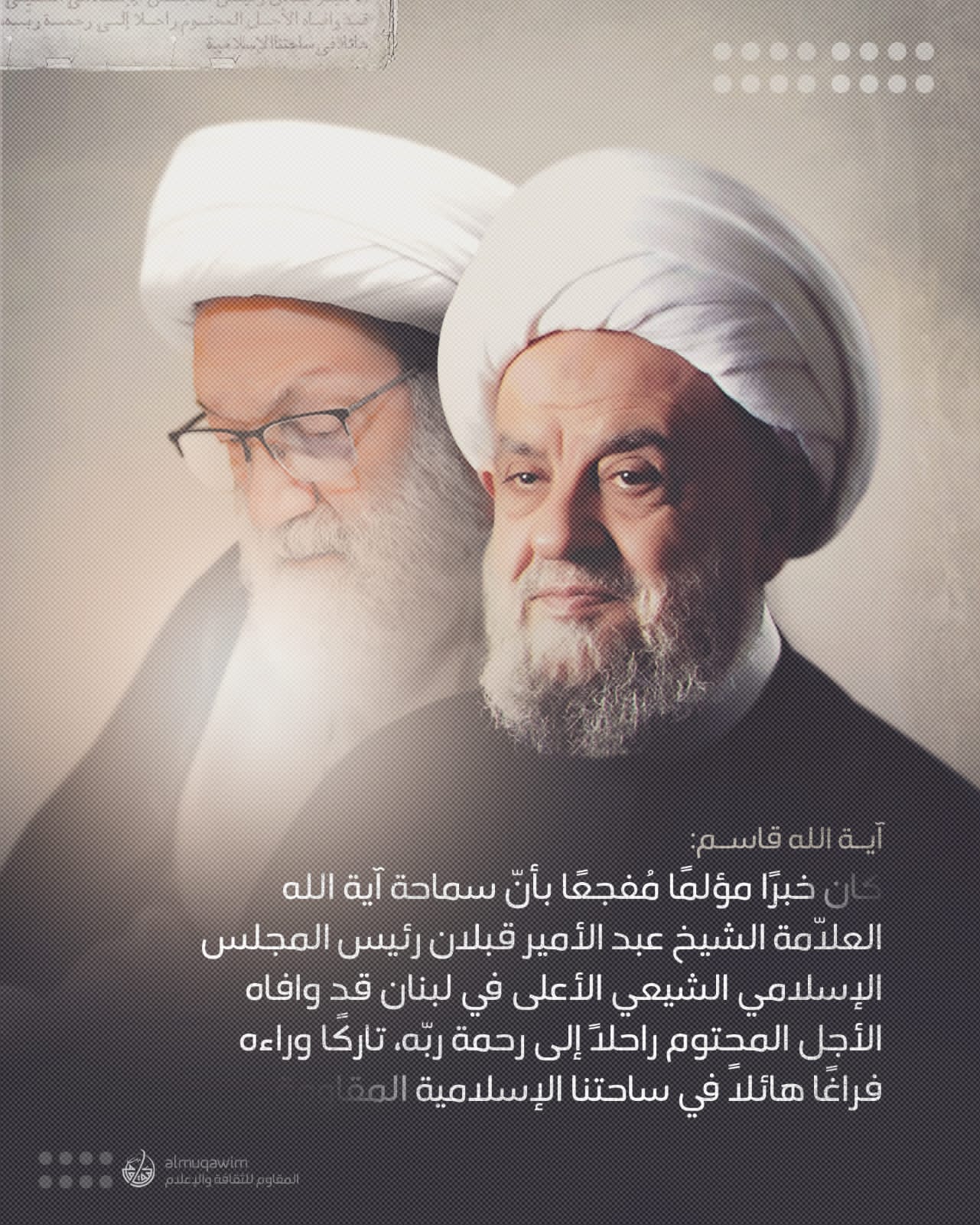 خبر وفات و رحلت آیت‌الله علامه شیخ عبدالامیر قبلان خبری حزن‌انگیز و دردآور است که باعث خلأى عميق در صحنه اسلام و مقامت ايجاد نمود. وی مردی عالم، عامل و مخلص نسبت اسلام و امت و وطنش بود. مجاهد فی سبیل الله که به رسول اکرم‌(ص) و اهل بیت‌(ع) و صالحین فقها و علمای با تقوای امت اقتدا نموده بود.