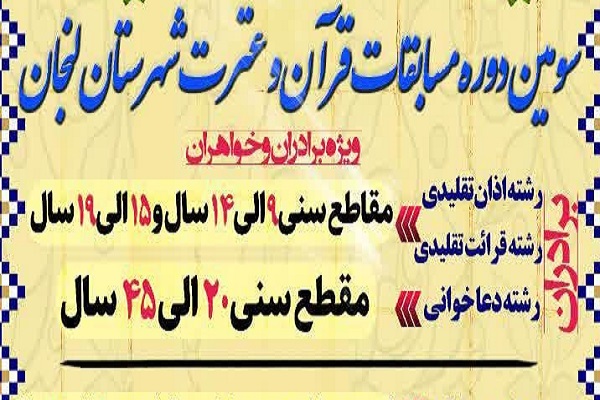به گزارش ایکنا، سومین دوره مسابقات قرآن و عترت از سوی مؤسسه فرهنگی ـ مردمی قرآن و عترت امام رضا(ع) شهرستان لنجان برگزار میشود.