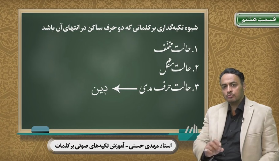 «در هشتمین قسمت از برنامههای آموزشی تکیههای صوتی کلمات قرآن کریم با آموزش شیوه تکیهگذاری بر کلمات دارای دو حرف ساکن پایانی همراه خواهیم بود.