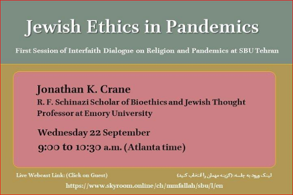 این وبینار امروز، 31 شهریورماه ساعت 16:30 تا 18 با محوریت «اخلاق یهودیت و پاندمی» و با حضور «جاناتان کی کرین» محقق اخلاق زیستی و اندیشه یهودی دانشگاه «اموری» (Emory) آمریکا برگزار خواهد شد و جلسه نخست از سلسله نشستهای دانشکده الهیات دانشگاه شهید بهشتی است.