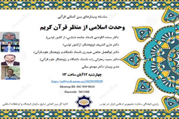 به گزارش ایکنا به نقل از سازمان فرهنگ و ارتباطات اسلامی، در راستای برگزاری سلسله وبینارهای بینالمللی قرآنی، نخستین نشست «وحدت اسلامی از منظر قرآن» امروز، 12 آبانماه ساعت 13 با همکاری رایزنی فرهنگی ایران در تونس و اداره کل بینالمللی تبلیغ سازمان فرهنگ و ارتباطات اسلامی برگزار میشود.