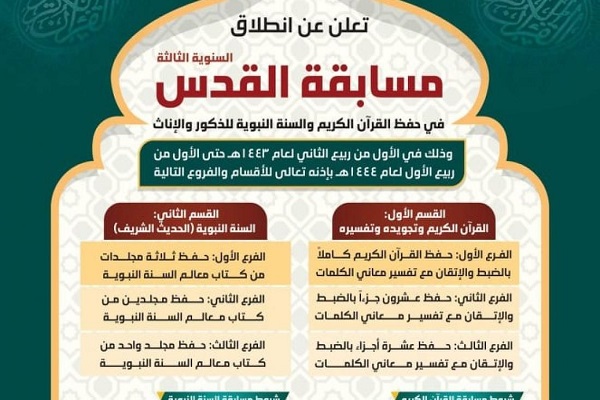 به گزارش ایکنا به نقل از فلسطین الیوم، کمیته ارشاد و انجمن اقرا در بیانیهای اعلام کرد: مسابقات قرآنی قدس از ابتدای ماه ربیعالثانی سال 1443 هجری قمری تا اول ربیعالاول سال 1444 هجری قمری برای ادارات و شعب مختلف آنها برگزار خواهد شد که مهمترین بخشهای آن به شرح زیر است: