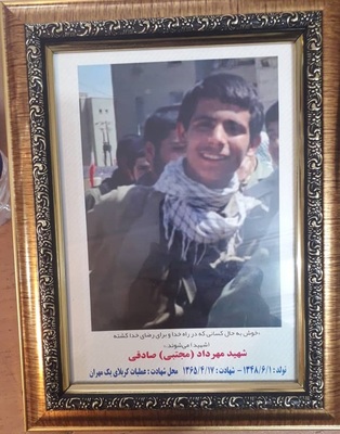 صادقی گفت: هنگامی که برای تحویل جسد فرزندم به معراجالشهدا رفتم، شاید بالغ بر هزار جنازه شهید وجود داشت. ردیفهای اجساد را یکی پس از دیگری به دنبال پیکر فرزندم گشتم تا اینکه از روی لباسهای چریکی که پوشیده بود شناختمش. علاقه خاصی به لباس پلنگی داشت و بر روی تمامی قطعات لباسهایش اسمش را نوشته بود تا پس از شهادتش سرنخی از او وجود داشته باشد.
