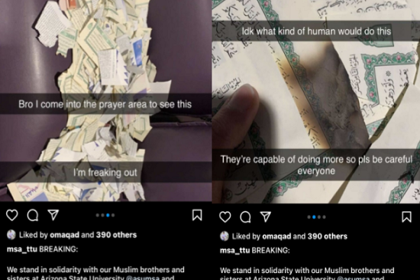 انجمن دانشجویان مسلمان دانشگاه ایالت آریزونا طی بیانیهای در اینستاگرام اعلام کرد این هتک حرمت و اقدام خرابکارانه هشتم دسامبر(17 آذر) در اتاق گفتوگوی بین ادیان در کتابخانه هیدن رخ داد؛ جایی که بسیاری از دانشجویان مسلمان در آنجا رفت و آمد میکنند.