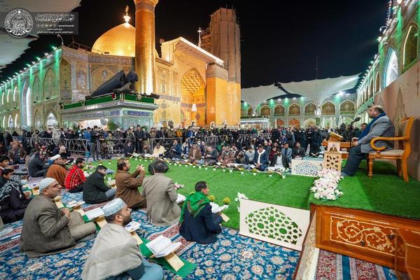 وی افزود: این محفل با تلاوت «استاد قاسم الجبوری»، قاری و مؤذن آستان علوی آغاز شد و در ادامه «استاد بلاسم جلیل»، قاری و مؤذن آستان مقدس امامین عسکریین(ع) به خواندن تواشیح دینی پرداخت.
