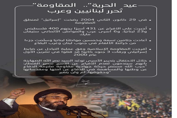 به گزارش ایکنا به نقل از العهد، ۱۸ سال پیش در چنین روزی، رژیم صهیونیستی با تسلیم شدن در برابر خواست مقاومت، ۴۳۱ اسیر مقاومت از جمله ۴۰۰ اسیر فلسطینی، ۲۳ لبنانی و شماری دیگر از اسرای مقاومت از سایر کشور‌های عربی را آزاد کرده و همچنین اجساد 59 شهروند لبنانی و بخشی از نقشه میدان‌های مین در جنوب لبنان و دره بقاع را به مقاومت تحویل داد.
