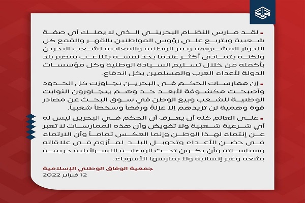 علاوه براین در پیام الوفاق تأکید شده است که امروز اقدامات رژیم بحرین فراتر از مرزهای این کشور رفته و ارزشها و اصول ثابت ملت را زیر پا گذاشته است. این رژیم وطن را برای کسب منابع جعلی قدرت فروخته است، امری که منجر نارضایتی مردم و طرد و عزل رژیم از جانب مردم خواهد شد.