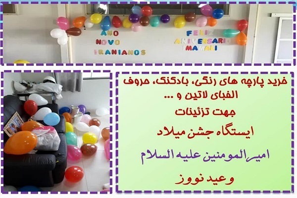تعداد زیادی بادکنکهای رنگی، پارچههای رنگی، شکلاتهای متنوع و نهایتاً پاکتهای پلاستیکی کوچک خریداری شد تا در جشن مولا امیرالمؤمنین(ع) استفاده شود.