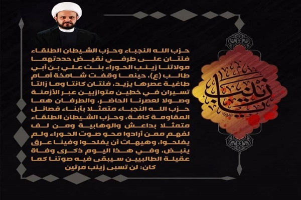 در این پیام آمده است: مولای ما حضرت زینب(س) در خطبه حماسی خود در مجلس یزید از رویارویی حزب الهی و برگزیده با حزب شیطان و بردگان آزاد شده سخن گفت.