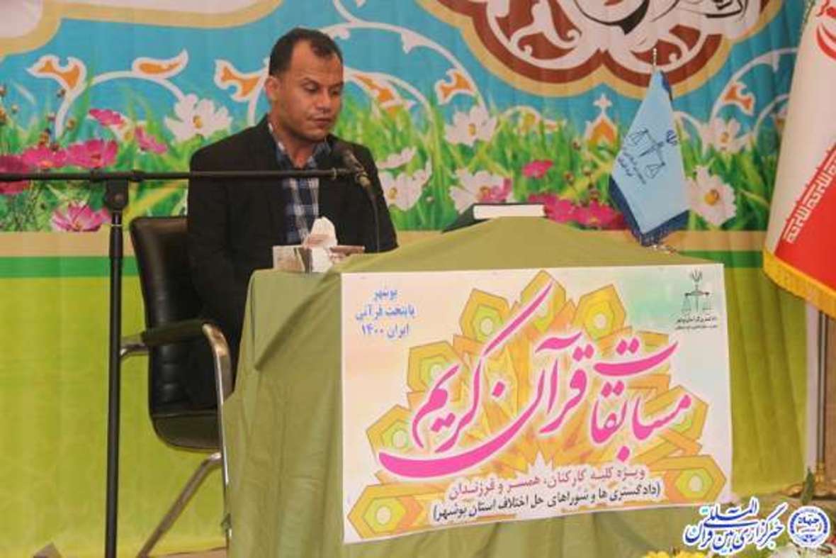 هاشمی با بیان اینکه که این دوره از مسابقات قرآنی قوه قضائیه بهمناسبت هفته قرآن و عترت بوشهر به عنوان نخستین پایتخت قرآنی ایران بوده، افزود: یونس حیدری حائز رتبه اول در رشته قرائت تحقیق بخش آقایان شد و مریم غلامی در رشته قرائت تحقیق موفق به کسب رتبه اول و نسیبهسادات بهرسی، رتبه دوم در این رشته قرآنی شدند.
