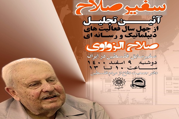 به گزارش ایکنا؛ فرهنگسرای رسانه و دفتر جمعیت دفاع از ملت فلسطین به پاس 40 سال فعالیت دیپلماتیک و رسانهای صلاح الزواوی، سفیر سابق فلسطین در ایران از وی در مراسمی تجلیل میکنند.