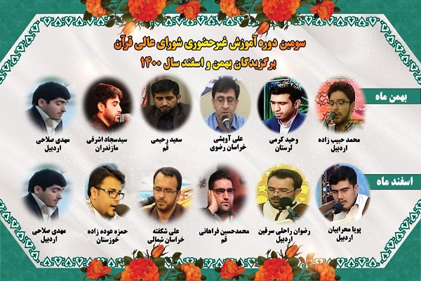 سعید رحیمی از قم، علی آویشی از خراسان رضوی، مهدی صلاحی و محمد حبیبزاده از اردبیل، وحید کرمی از لرستان، سیدسجاد اشرفی از مازندران، برگزیدگان بهمنماه و حمزه عودهزاده از خوزستان، رضوان راحلی سرقین، مهدی صلاحی و پویا محرابیان از اردبیل، علی شکفته از خراسان شمالی و محمدحسین فراهانی از قم، برگزیدگان اسفندماه هستند.