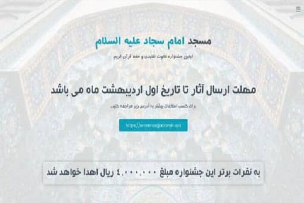 به گزارش ایکنا، اولین جشنواره قرآنی مسجد امام سجاد(ع) در دو رشته حفظ جزء 30 قرآن و تلاوت تقلیدی برگزار خواهد شد و علاقهمندان تا اول اردیبهشت مهلت ثبت نام در این جشنواره را دارند.