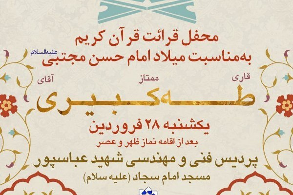 به گزارش ایکنا، محفل قرائت قرآن کریم، به مناسبت ماه مبارک رمضان، و مصادف با ولادت امام حسن مجتبی(ع) از سوی دانشگاه شهید بهشتی برگزار میشود.