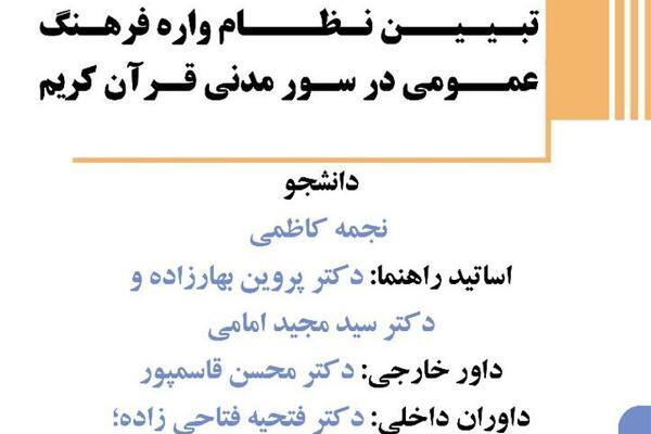 به گزارش ایکنا، رساله دکتری «تبیین نظامواره فرهنگ عمومی در سور مدنی قرآن کریم» توسط نجمه کاظمی تدوین شده و پروین بهارزاده و سیدمجید امامی، راهنمایی آن را بر عهده داشتهاند. داوری این جلسه دفاعیه نیز بر عهده محسن قاسمپور، فتحیه فتاحیزاده و سهیلا جلالی کندری است.