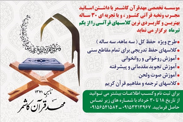 به گزارش ایکنا به نقل از پایگاه اطلاعرسانی مؤسسه مهد قرآن، زهرا عاصمی، مدیر مهد قرآن شهرستان کاشمر استان خراسان رضوی از برگزاری دورههای ویژه آموزش حفظ و دیگر علوم قرآنی در تابستان سال جاری خبر داد.