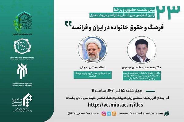 به گزارش ایکنا، بیستوسومین پیش نشست نخستین کنفرانس بینالمللی خانواده و تربیت معنوی با موضوع «فرهنگ و حقوق خانواده در ایران و فرانسه» به همت پژوهشگاه حوزه و دانشگاه، جامعة المصطفی(ص) و مؤسسه خانواده اسلامی و تربیت معنوی به صورت حضوری و برخط برگزار میشود.