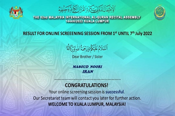 مسعود نوری، قاری بین‌المللی کشورمان به دور پایانی مسابقات بین‌المللی قرآن در مالزی راه یافت.