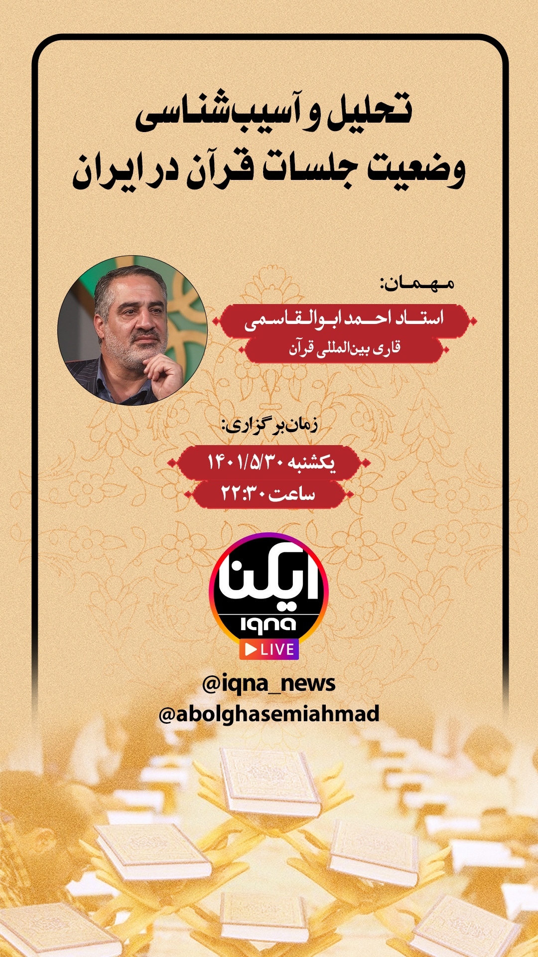 این نشست به صورت مجازی از طریق صفحه اینستاگرامی ایکنا به نشانی iqna_news پخش خواهد شد. احمد ابوالقاسمی، قاری پیشکسوت و بین‌المللی قرآن به عنوان کارشناس حضور دارد و پاسخگوی پرسش‌های خبرنگار ایکنا خواهد بود.