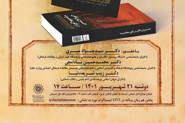 به گزارش ایکنا به نقل از روابط عمومی فرهنگسرای سرو، آئین رونمایی از کتاب «حسینبنعلی در افق معاصرت؛ بازخوانی انتقادی حسین وارث آدم» نوشته سیدجواد میری و زینب شریعتنیا، دوشنبه 21 شهریور، ساعت 17 در خانه موزه شریعتی برگزار میشود.
