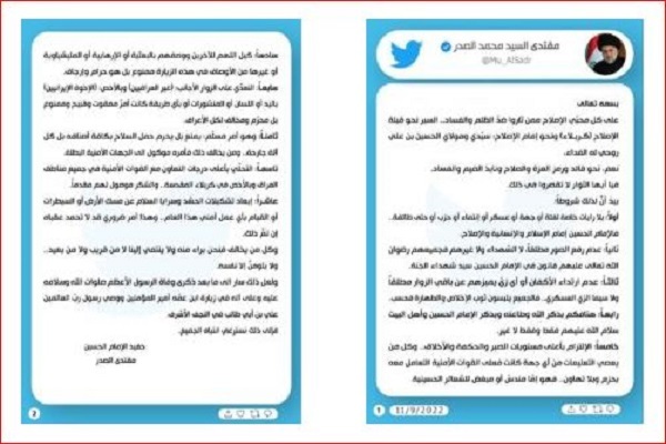 مقتدی صدر، رهبر جریان صدر عراق طی شروطی دهگانه، زائران حاضر در پیاده‌روی اربعین را به پایبندی به قوانین معمول در عراق فراخواند و بر احترام به زائران غیر عراقی به ویژه ایرانیان تأکید کرد.