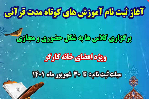 حسین فلاح خوشمشرب، معاون دارالقرآن خانه کارگر در گفتوگو با ایکنا، با اشاره به آغاز ثبتنام آموزشهای کوتاهمدت قرآن ویژه کارگران سراسر کشور گفت: پیرو مصوبه شورای آموزش دارالقرآن خانه کارگر، ثبت نام دورههای آموزش کوتاه مدت علوم قرآنی ویژه کارگران سراسر کشور برای سال ۱۴۰۱ ویژه فصل جدید آغاز شد.