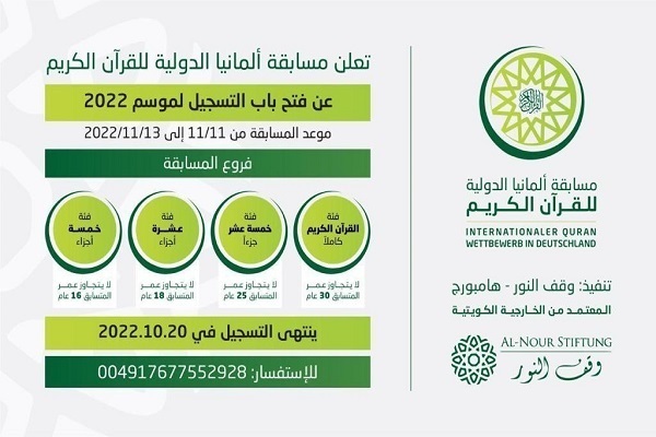 دانیال عابدین، مسئول برگزاری این مسابقات و مدیر سازمان وقف النور و نایب رئیس شورای عالی مسلمانان آلمان در سخنانی تصریح کرد که ثبت نام در این مسابقات حداکثر تا 30 اکتبر جاری به پایان می‌رسد.