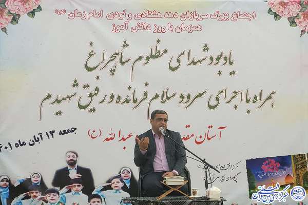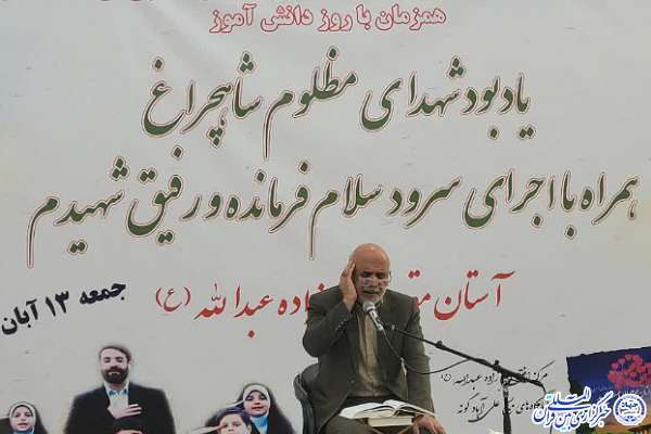 به گزارش خبرنگار افتخاری ایکنا، مراسم یادبود شهدای حرم شاهچراغ(ع) همراه با اجرای سرودهای «رفیق شهیدم» و «سلام فرمانده» با خوانندگی ابوذر روحی و همخوانی دانشآموزان دختر و پسر هیئت مذهبی انصارالمهدی(عج)، ۱۳ آبانماه در آستان مقدس امامزاده عبدالله(ع) روستای علیآباد گونه شهر کرج برگزار شد.