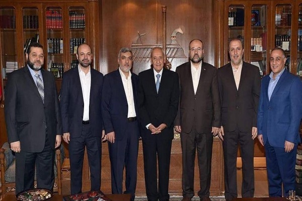 یک هیئت از رهبران جنبش حماس امروز شنبه با نبیه بری رئیس مجلس نمایندگان لبنان در بیروت دیدار و گفت‌وگو کرد.
