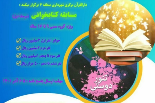 به گزارش ایکنا، دارالقرآن مرکزی منطقه ۳ شهرداری تهران اقدام به برگزاری مسابقه کتابخوانی «تنور دوستی» کرده است. این مسابقه در چند مرحله برگزار میشود که مرحله اول آن ویژه نوجوانان ۹ تا ۱۶ ساله است.