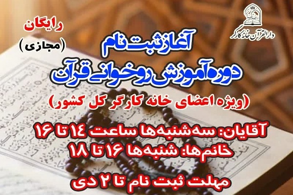 دوره آموزشی روخوانی قرآن کریم دارالقرآن خانه کارگر به صورت رایگان و به شکل مجازی در سراسر کشور برگزار میشود.