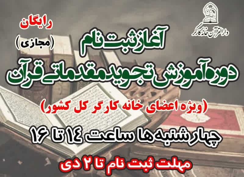 دوره آموزش تجوید قرآن کریم دارالقرآن خانه کارگر به صورت رایگان و به شکل مجازی در سراسر کشور برگزار میشود. ساعت برگزاری این کلاس چهارشنبهها از ساعت ۱۴ تا ۱۶ اعلام شده است.