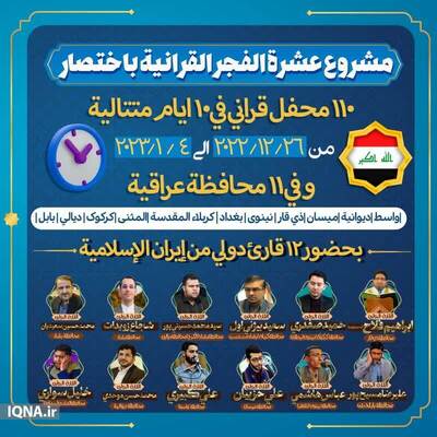 به گزارش ایکنا، ١١٠ محفل انس با قرآن در ١١ استان عراق بهمناسبت سومین سالگرد شهادت سردار دلها شهید حاج قاسم سلیمانی و شهید ابومهدی المهندس، با عنوان «دهه فجر قرآنی» به مدت ١٠ شب از ۵ تا ١٤ دی ماه در استانهای بغداد، کربلا، دیوانیه، دیالی، بابل، واسط، المثنى، ذیقار، کرکوک، العماره و موصل برگزار میشود.