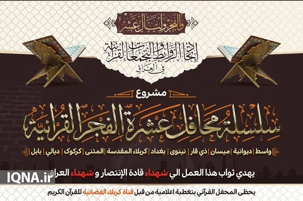 به گزارش ایکنا، ١١٠ محفل انس با قرآن در ١١ استان عراق به‌مناسبت سومین سالگرد شهادت سردار دل‌ها شهید حاج قاسم سلیمانی و شهید ابومهدی المهندس، با عنوان «دهه فجر قرآنی» به مدت ١٠ شب از ۵ تا ١٤ دی ماه در استان‌های بغداد، کربلا، دیوانیه، دیالی، بابل، واسط، المثنى، ذی‌قار، کرکوک، العماره و موصل برگزار می‌شود.
