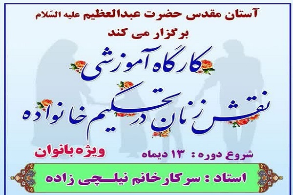 به گزارش ایکنا، به همت معاونت امور علمی و فرهنگی آستان حضرت عبدالعظیم(ع)، کارگاه آموزشی «نقش زنان در تحکیم خانواده» از روز سه‌شنبه، 13 دی‌ماه به صورت هفتگی در این آستان برگزار می‌شود.