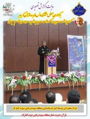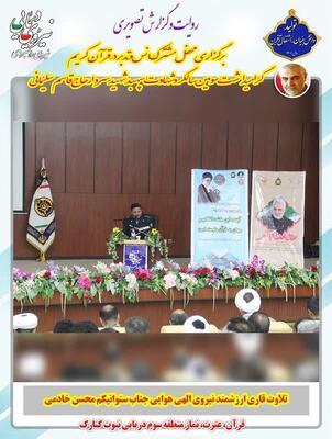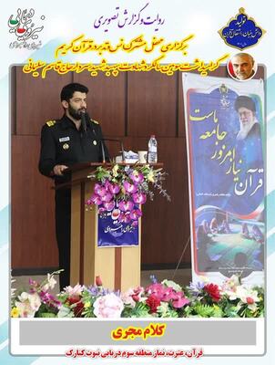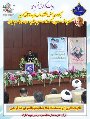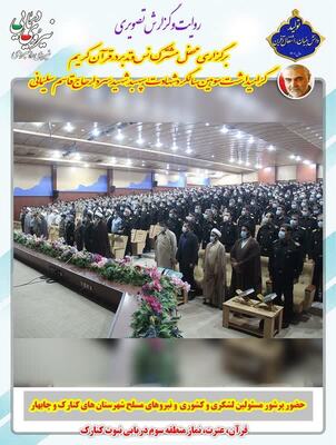 محفل مشترک انس و تدبر در قرآن‌به گزارش ایکنا، محفل انس و تدبر در قرآن‌، گرامیداشت سومین سالروز شهادت سپهبد شهید سردار حاج قاسم سلیمانی، امروز، 13 دی‌ماه با حضور مسئولان لشکری و کشوری شهرستان‌های کنارک و چابهار در مجتمع بزرگ ولایت منطقه سوم دریایی نبوت ارتش  کنارک برگزار شد.