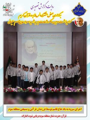 همچنین ویژه‌برنامه‌های متنوع دیگری در حوزه قرآن، عترت و نماز گرامیداشت سومین سالروز شهادت سردار حاج قاسم سلیمانی در سطوح مختلف سنی به همراه کرسی تلاوت قرآن و تجدید بیعت قرآنیان با آرمان‌های امام و شهدا ویژه خانواده‌ها، جشنواره فرهنگی و قرآنی با موضوع نماز و مهدویت ویژه دانش‌آموزان و اساتید مدارس کوی سازمانی و مهد و پیش دبستانی حضرت فاطمه الزهرا(س) و برنامه‌هایی ویژه کارکنان وظیفه در سطح منطقه و تیپ سوم پیش‌بینی و برگزار خواهد شد.
