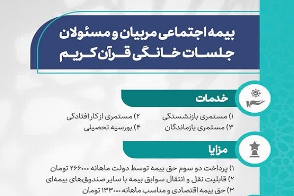 به گزارش ایکنا، ستاد مردمی جلسات خانگی قرآن مدتی است که با همکاری اتحادیه کشوری موسسات و تشکلهای قرآن و عترت، طرح بیمه مسئولان و مربیان جلسات خانگی قرآن کریم را که فاقد بیمه بازنشستگی هستند راهاندازی کرده است تا از خدمات مستمری بازنشستگی، ازکارافتادگی و فوت با حمایت دوسوم حق بیمه توسط دولت برخوردار شوند.