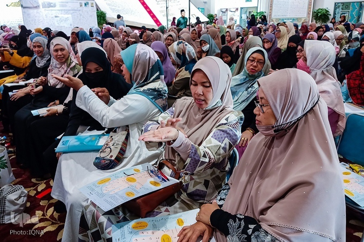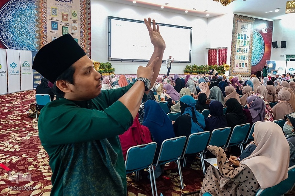 مربی قرآن مالزیایی حاضر در جشنواره هنرهای قرآنی رستو درباره روش ابداعی خود برای آموزش مخارج حروف و تجوید قرآن که به کمک انگشتان دست صورت می‌گیرد، توضیحاتی ارائه کرد.